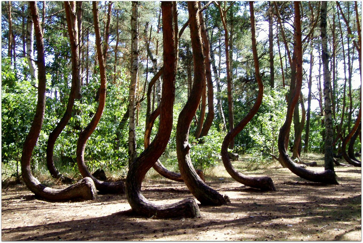 Кривой лес — одно из самых странных мест Европы. Здесь растут около 400 сосен, и все они изгибаются почти одинаково у основания, словно были специально «согнуты» по шаблону.